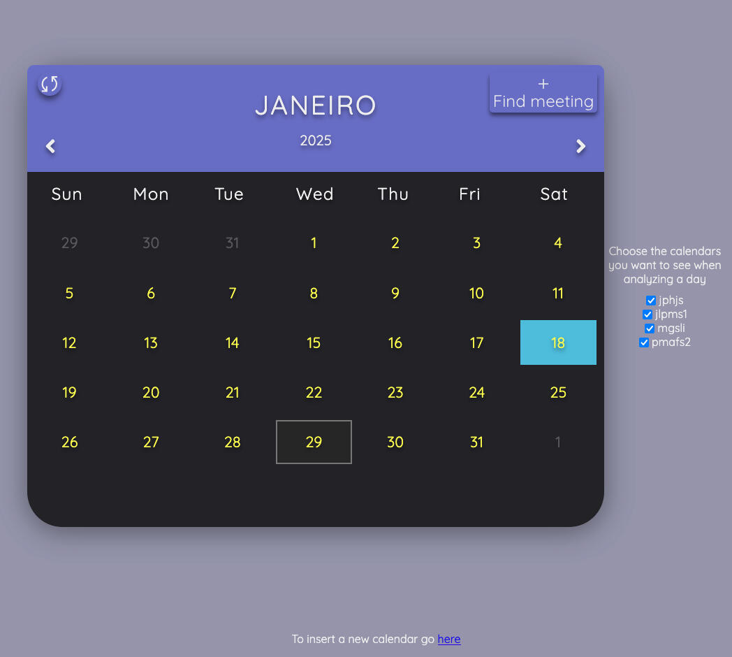 Developed as a coursework project in a SCRUM methodology with 4 colleagues. This tool manages people schedules by importing webcal links. Simplifies event management and meeting scheduling by cross-referencing multiple calendars for optimal availability.Tech used